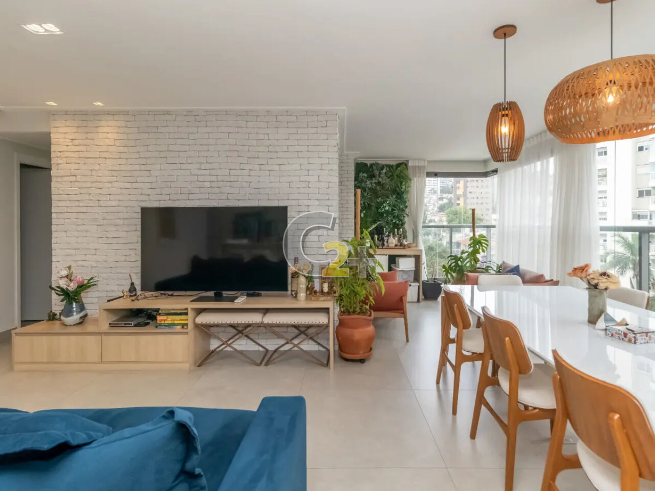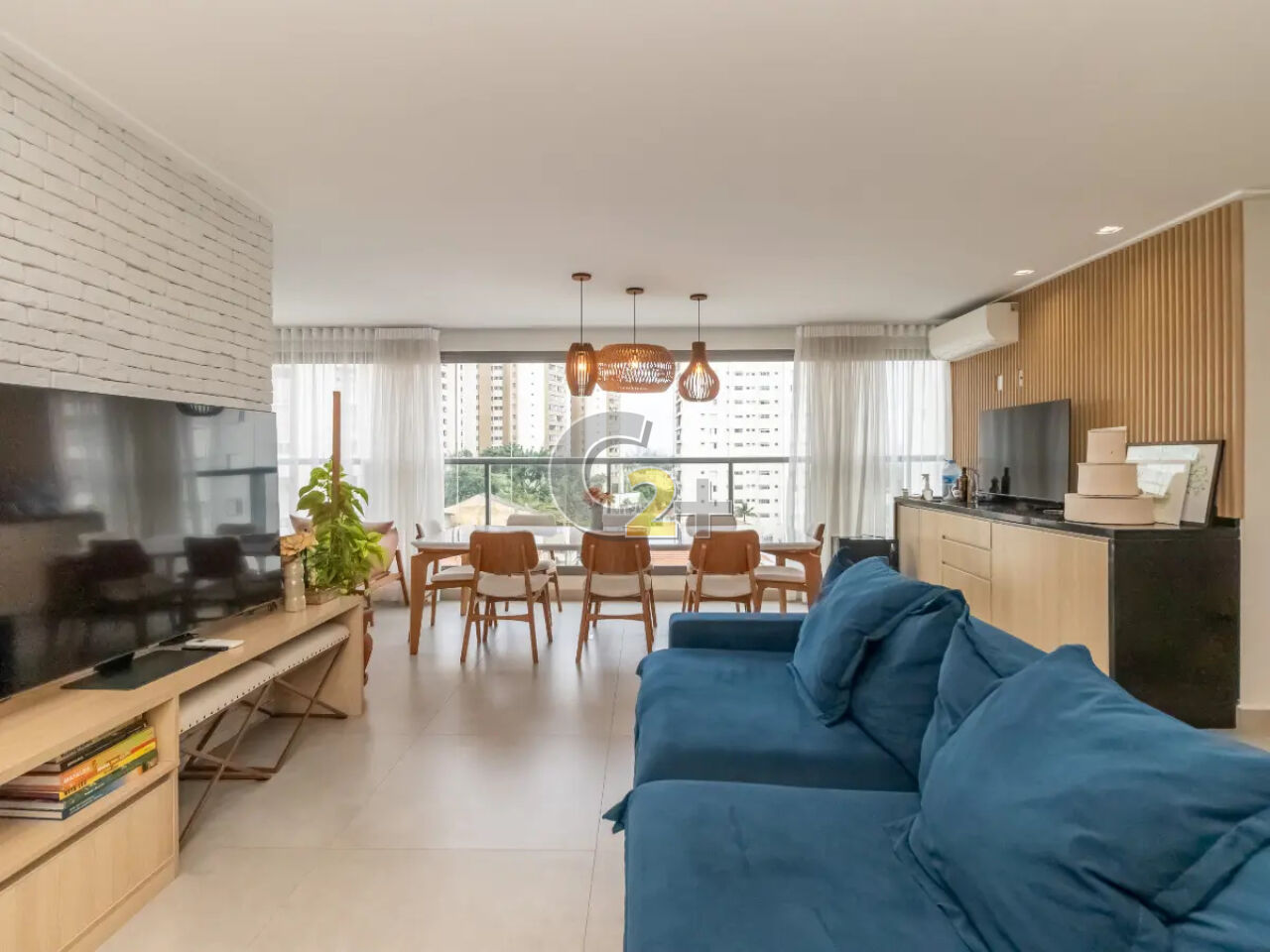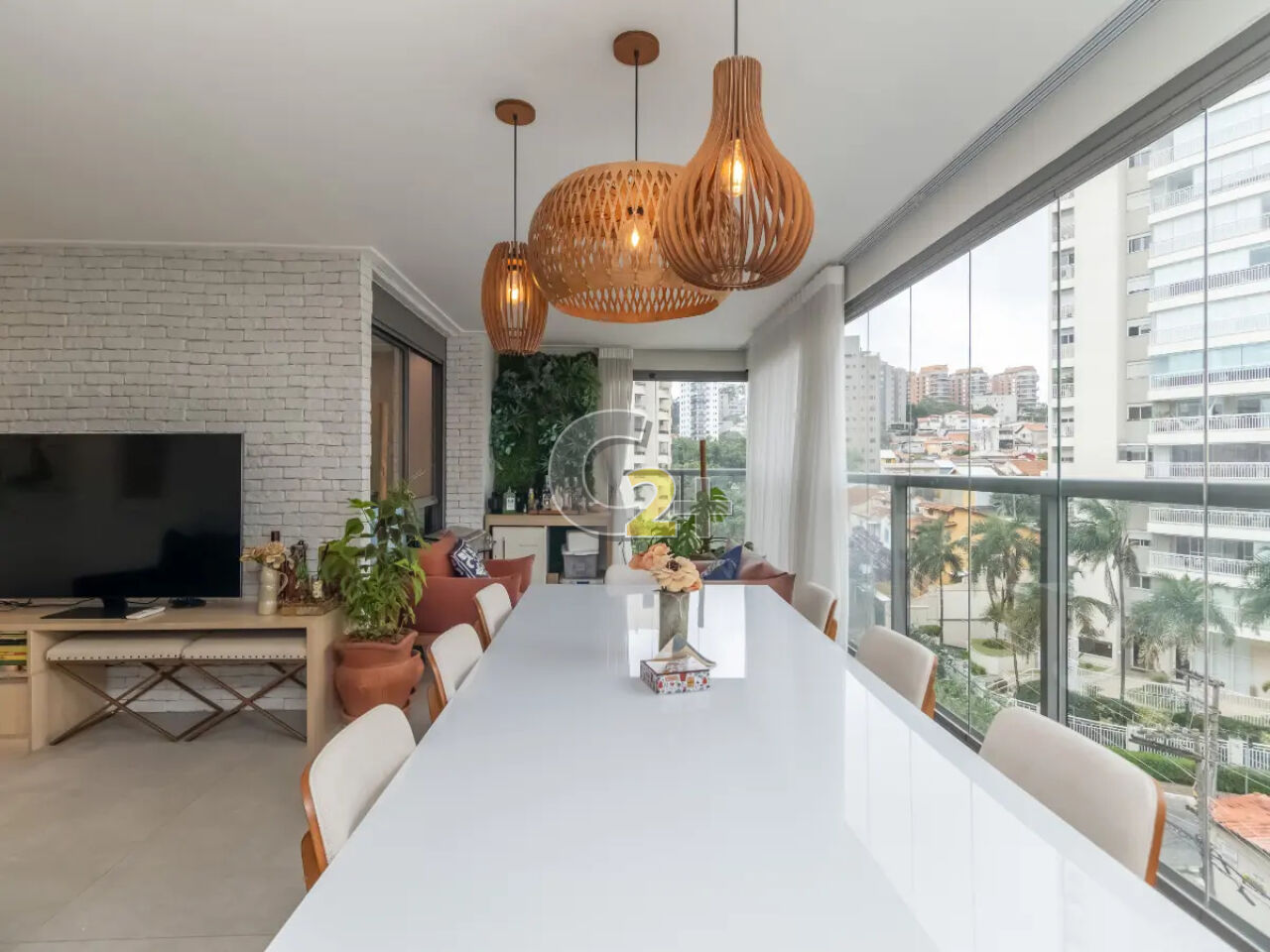 O imóvel está mobiliado, com móveis e eletrodomésticos novos e de alto padrão (sofá, mesas, cadeiras e mais).