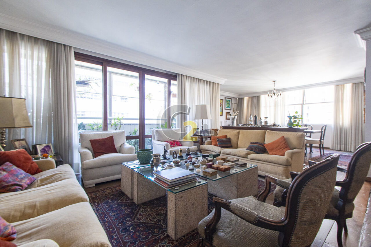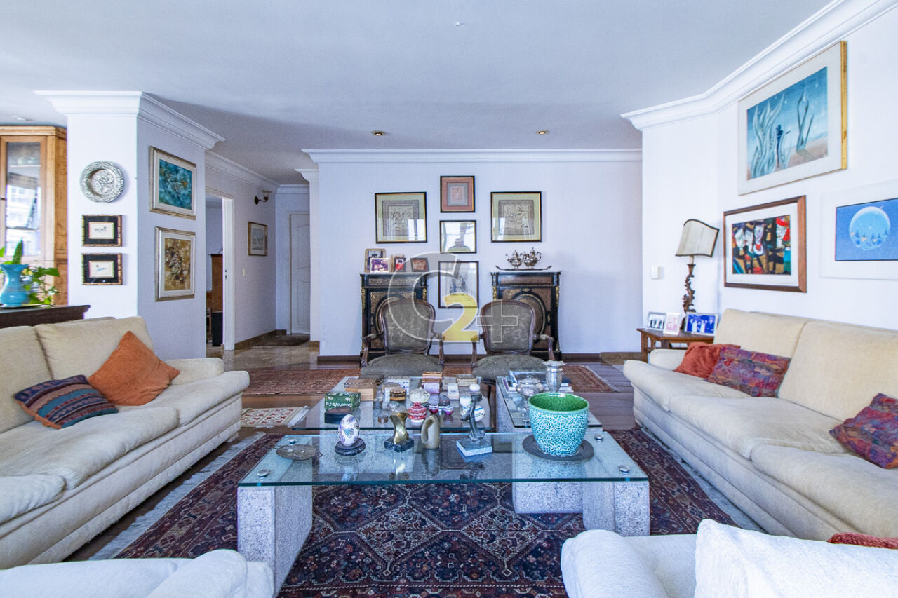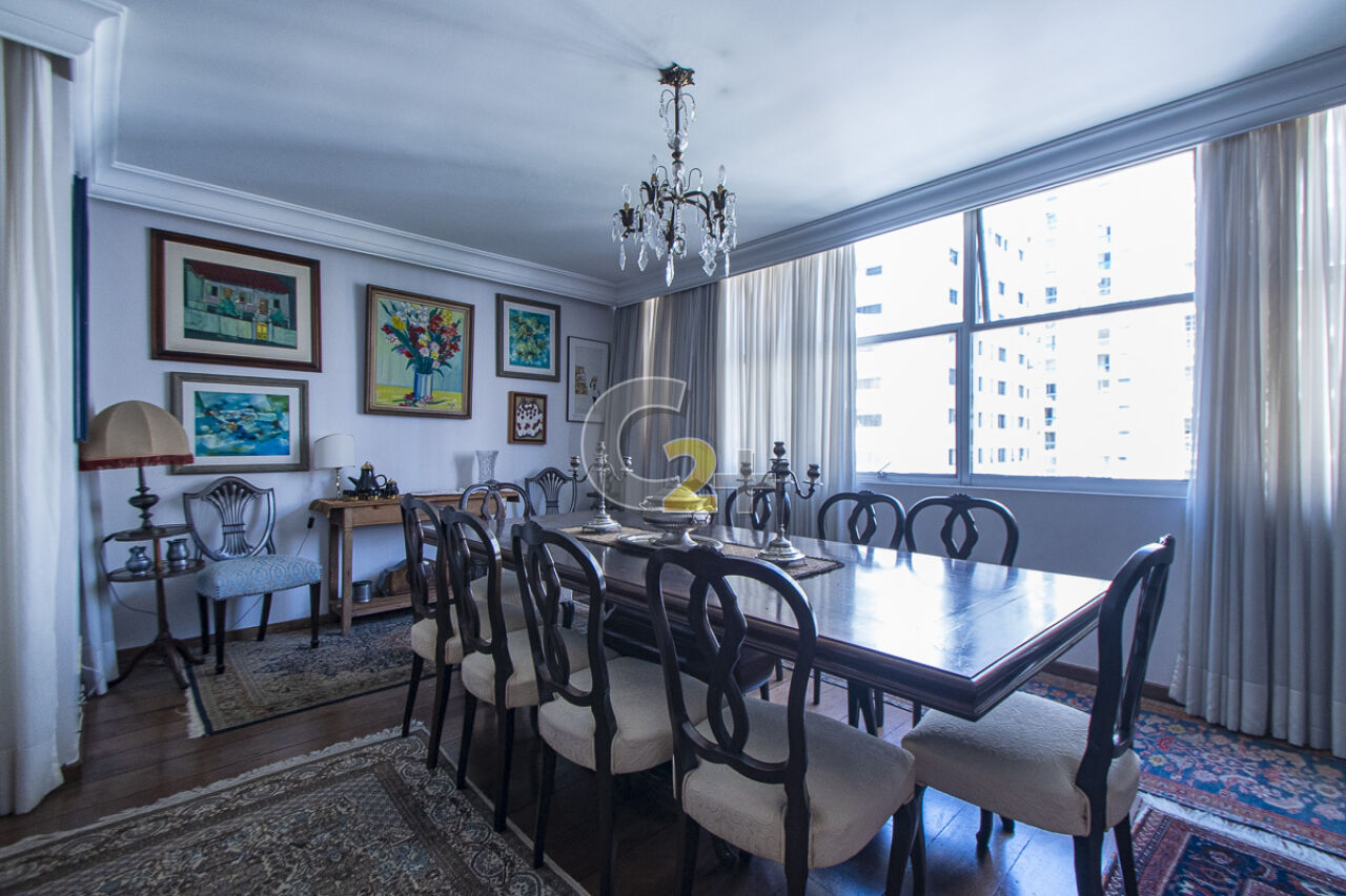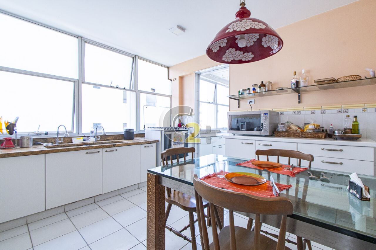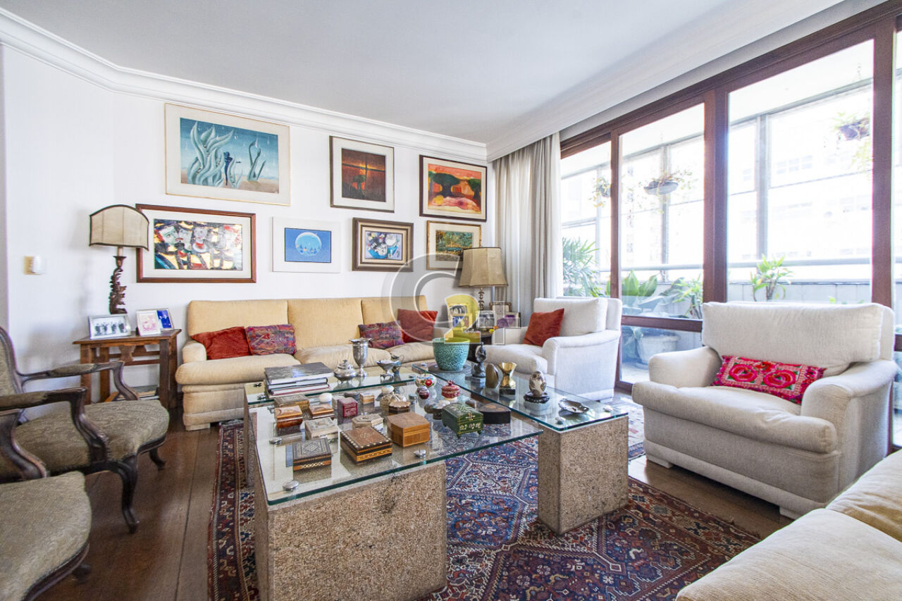 Apartamento à venda em Higienópolis com 263m², 4 quartos, sendo 2 suítes, sala para 3 ambientes com piso de madeira, janelão, ensolarado, cozinha moderna com armários planejados e área de serviço com dependência completa repletos de armários embutidos, banheiros com ventilação natural e box de vidro, 2 vagas de garagem fixa.