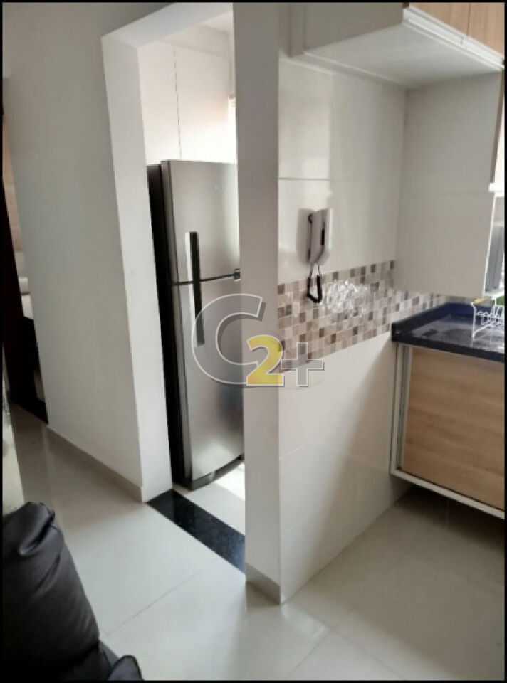 Apartamento á venda no Tatuapé com 40m² mobiliado, 2 quartos, banheiro, sala com cozinha integrada, área de serviço e com 1 vaga de garagem.
