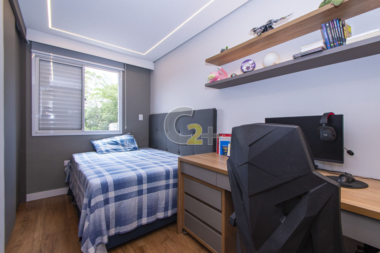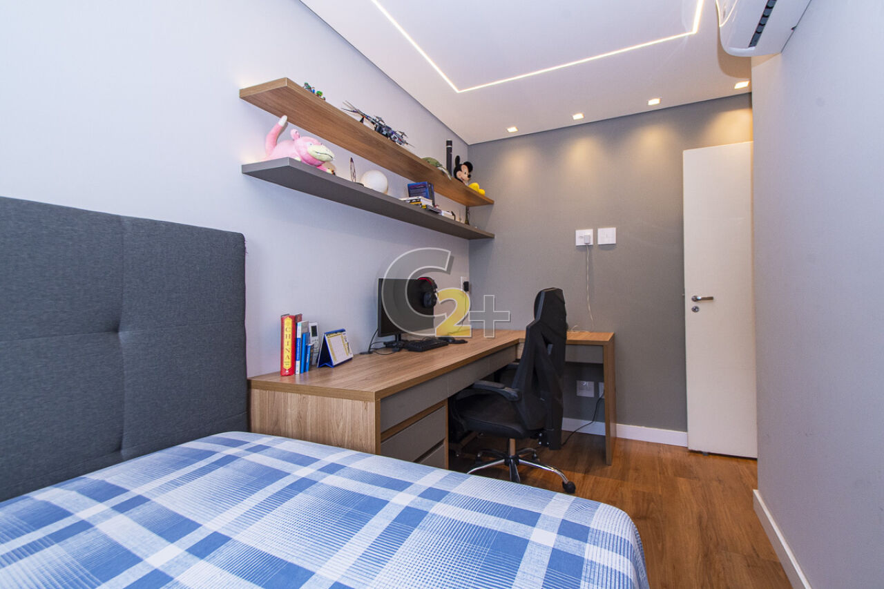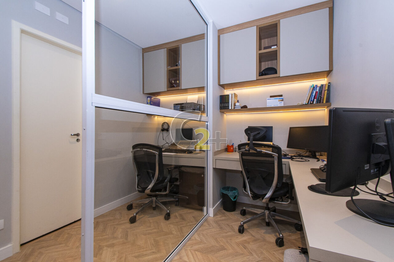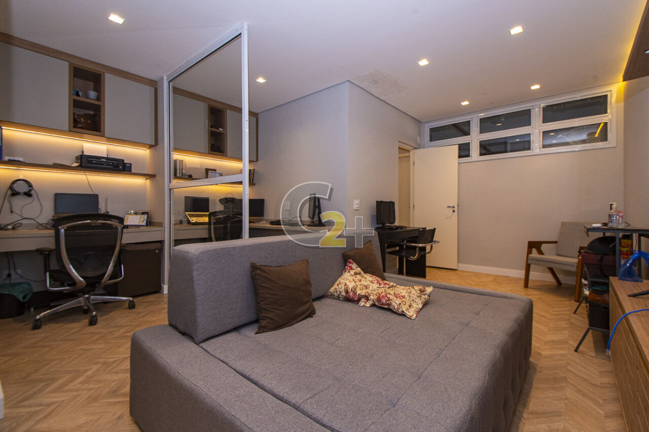 No piso inferior temos uma suíte de serviço, quarto e banheiro de empregada, o quarto está sendo utilizado atualmente como escritório, com mesa e armários para trabalhar e estudar com privacidade e conforto. Acesso integrado ao local que contempla o espaço privativo utilizado como área de serviço e depósito, repleto de armários, prateleiras, com janelas.