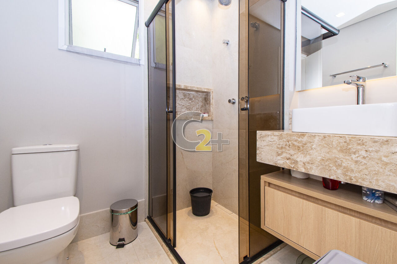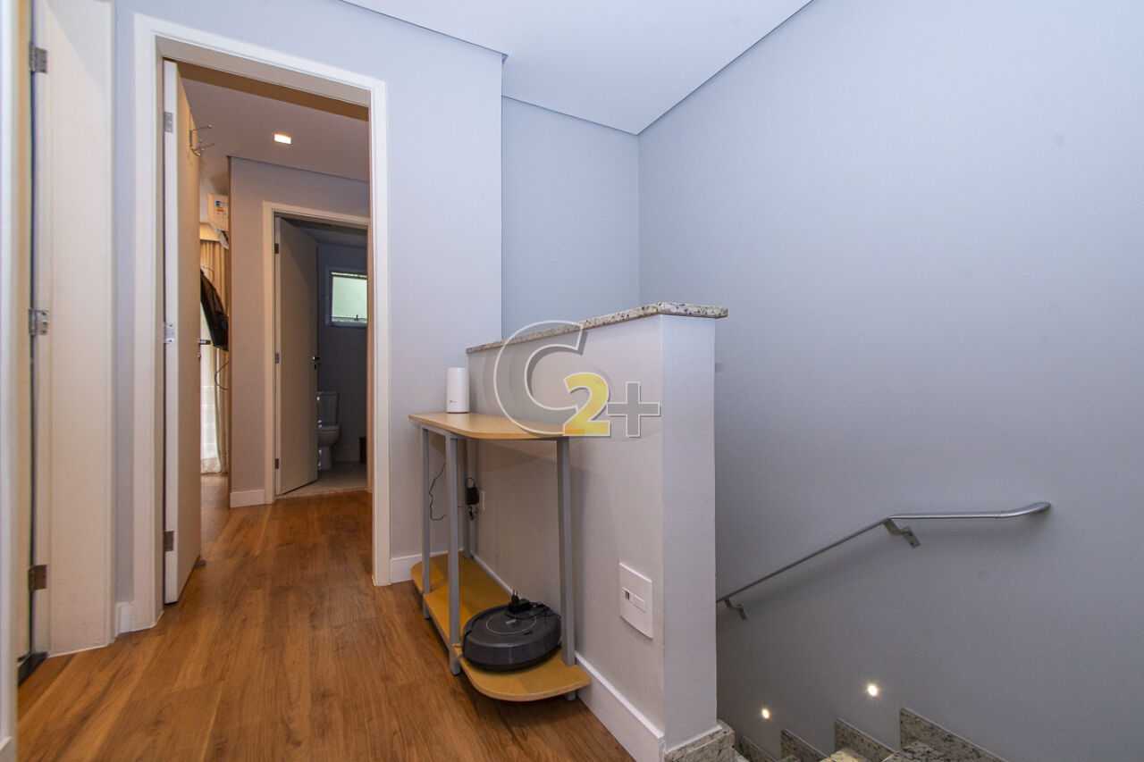 No piso superior são 2 quartos com armários planejados e vista para os fundos, os quais recebem o sol da tarde, banheiro social, com possibilidade de ser revertido em suíte, iluminado e ventilado por claraboia . O charmoso hall, uma opção de sala de estar aconchegante, entre os ambientes. A suíte master com closet, ar condicionado, varanda e vista para o jardim e rua, você merece curtir o conforto desse ambiente, relaxando e apreciando o sol da manhã.