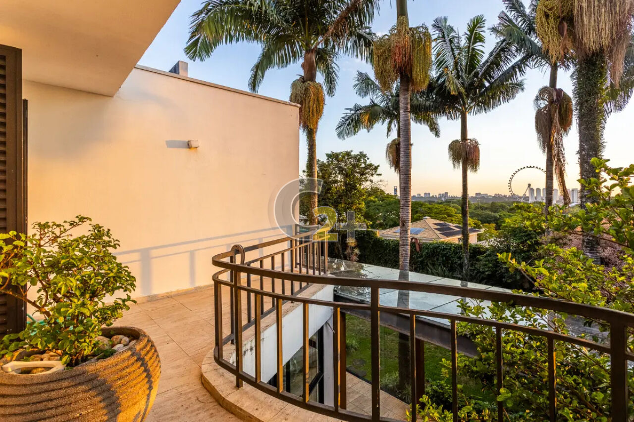No pavimento superior, são 4 dormitórios (4 suítes), além de 4 closets e uma varanda contínua com vista para o jardim. Na área de serviço, há 2 quartos e 1 banheiro, além de garagem coberta para 2 e descoberta para 6 veículos.