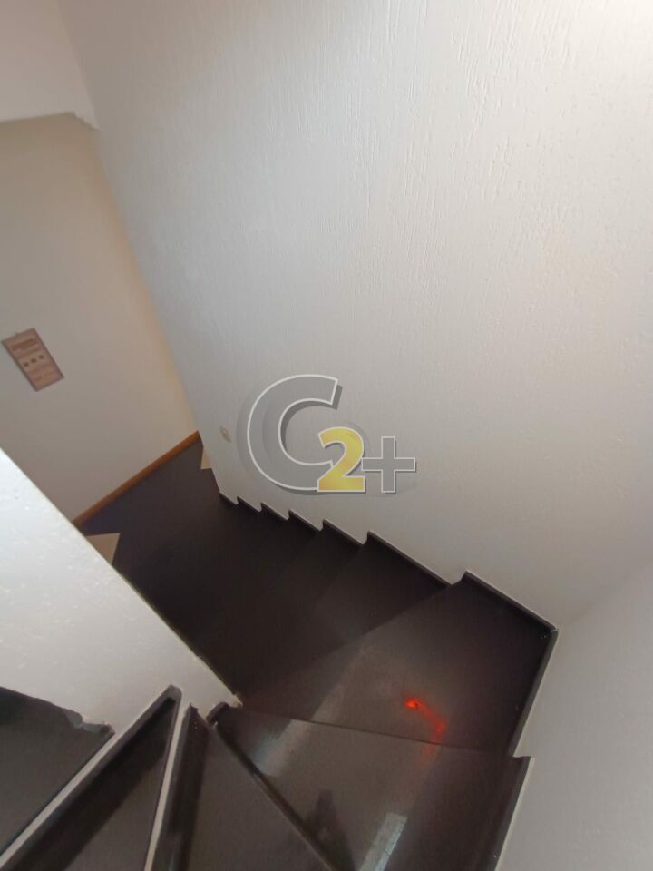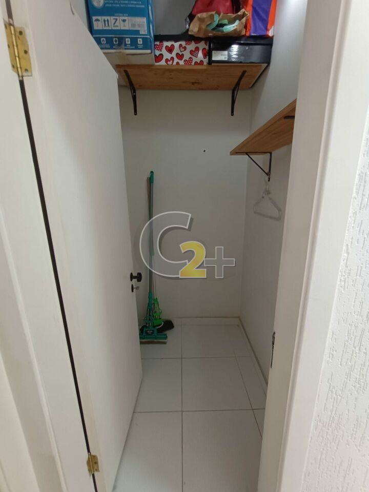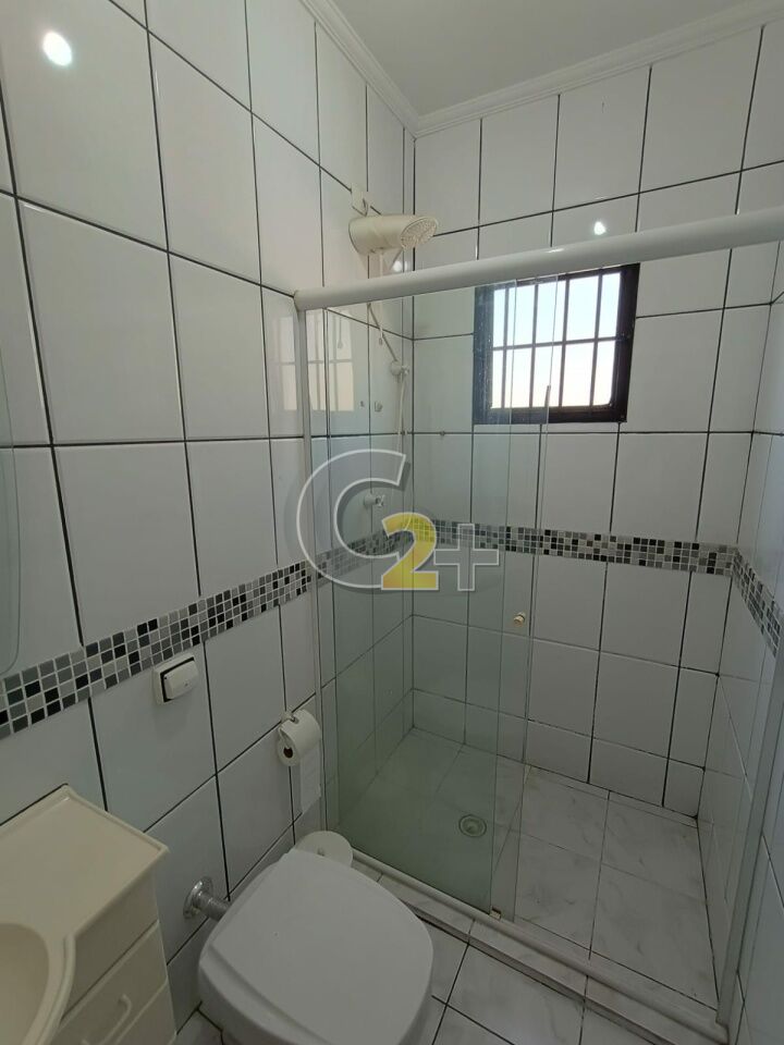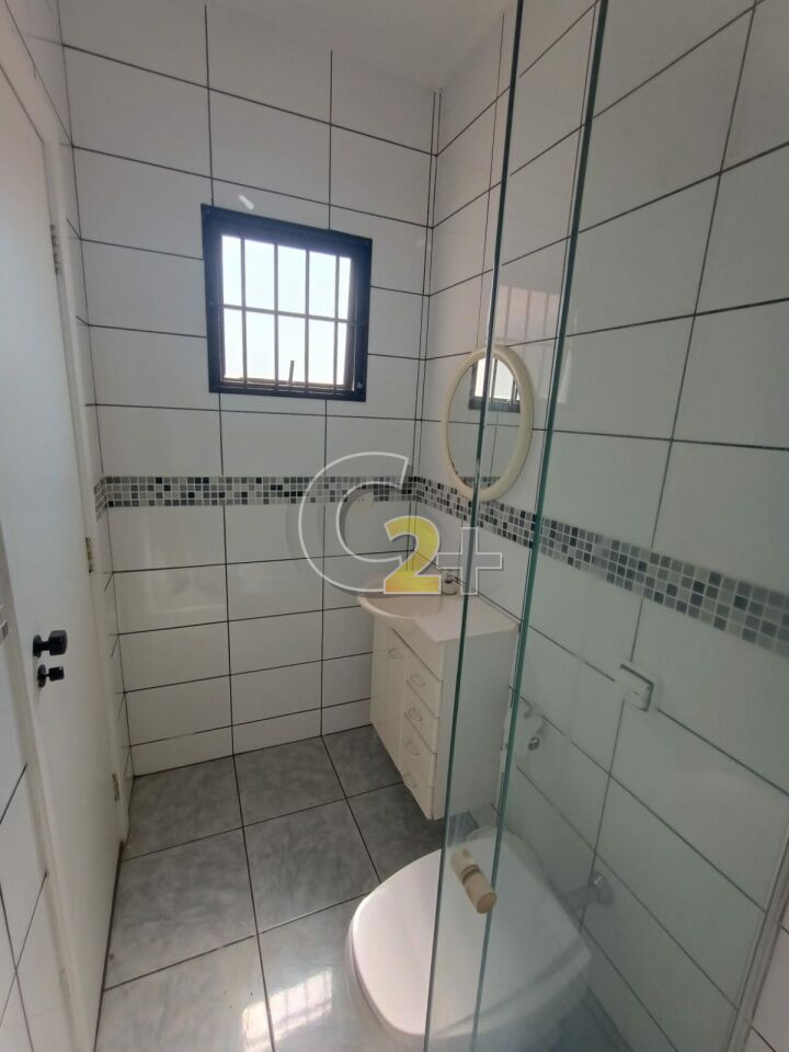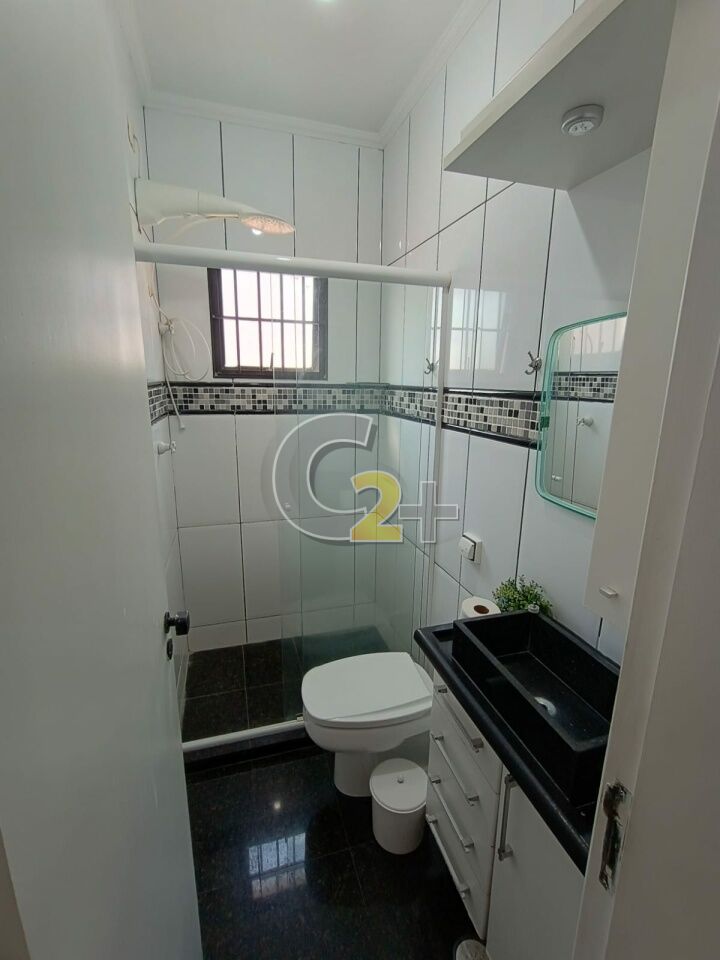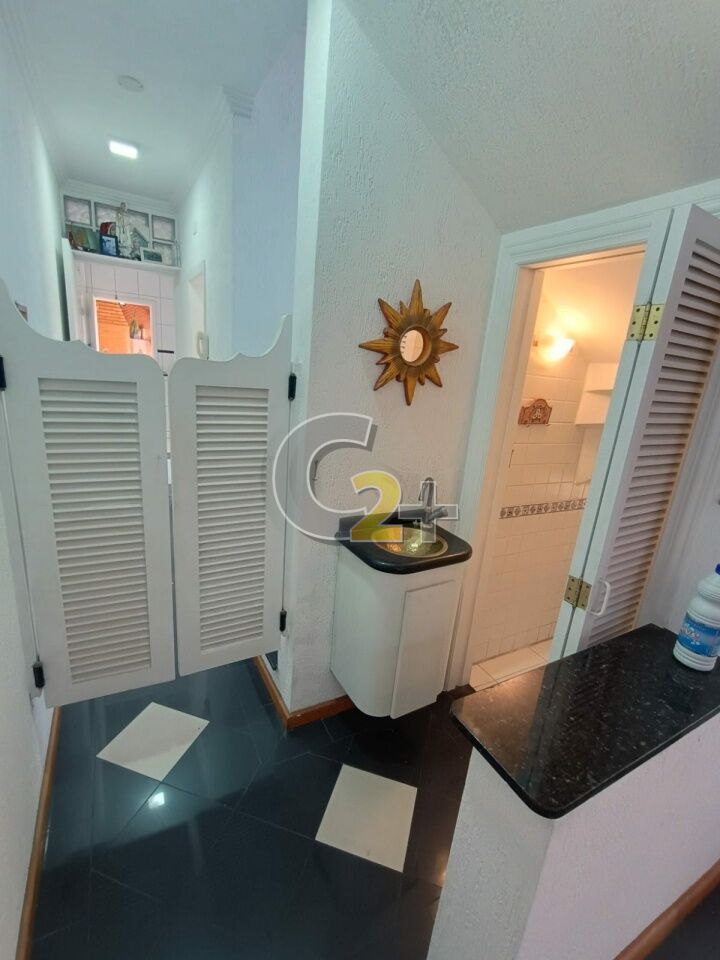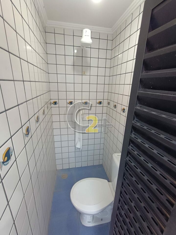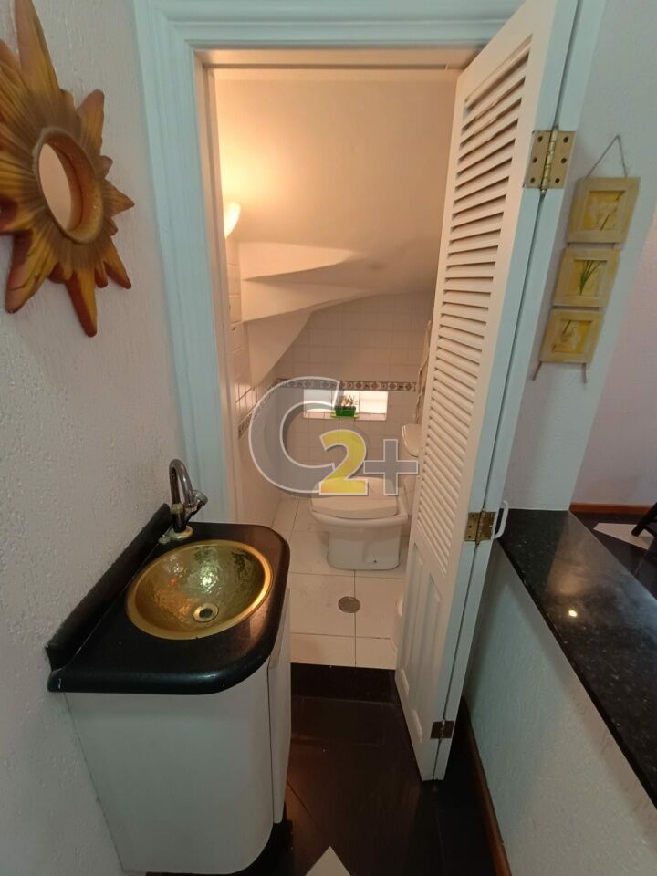 Sala para dois ambientes com lavabo, piso porcelanato.