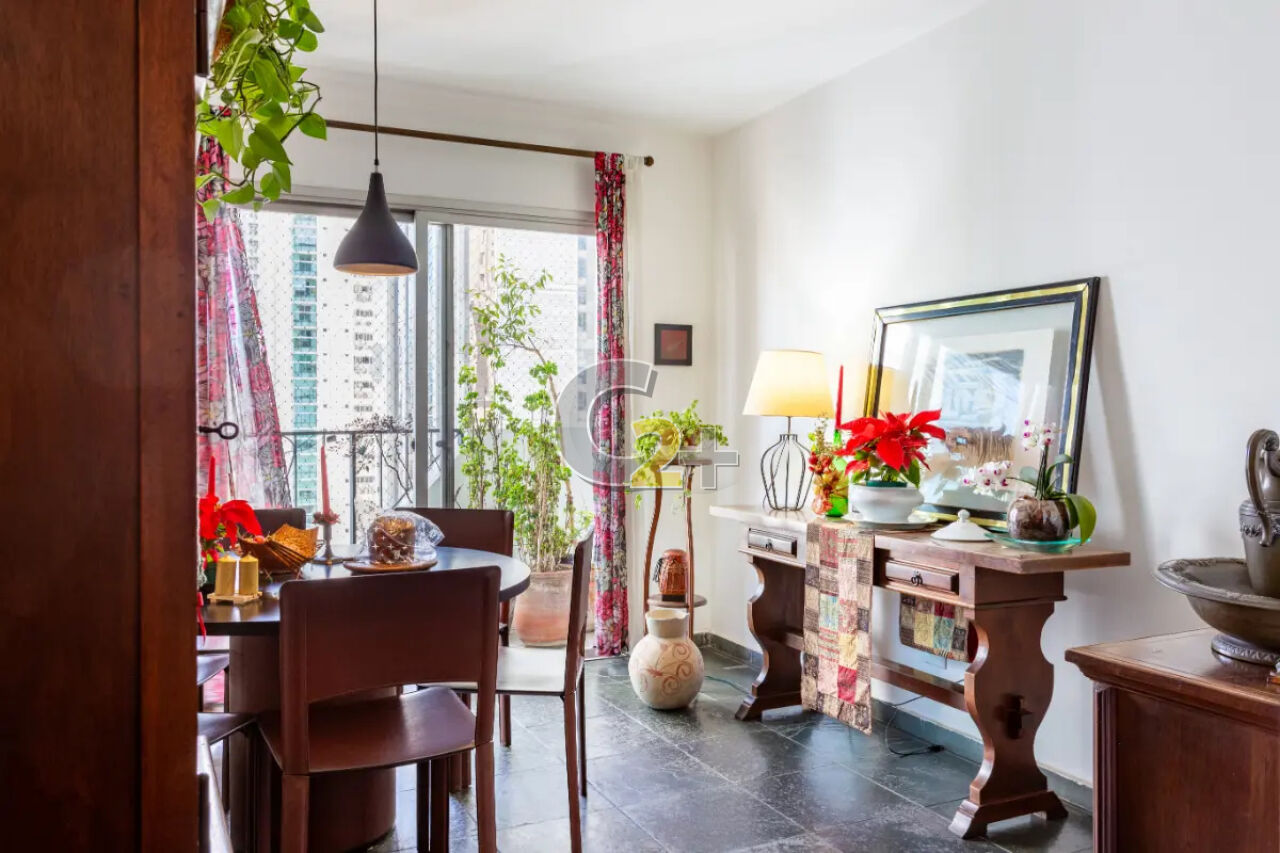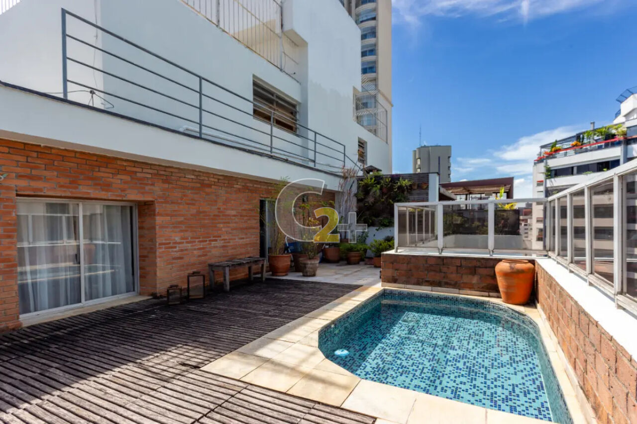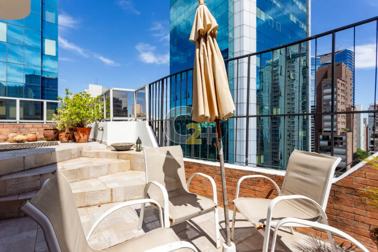 Cobertura duplex á venda no Itaim Bibi com 173m², 3 quartos sendo 1 suíte, sala para 2 ambientes com lareira, varanda e terraço com piscina, banheiro, cozinha, área de serviço e com 2 vagas de garagem.